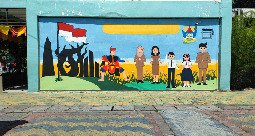 Mural bertema "Seni dan Kebudayaan di Surabaya" tergambar di tembok SMPN 29 Surabaya,
